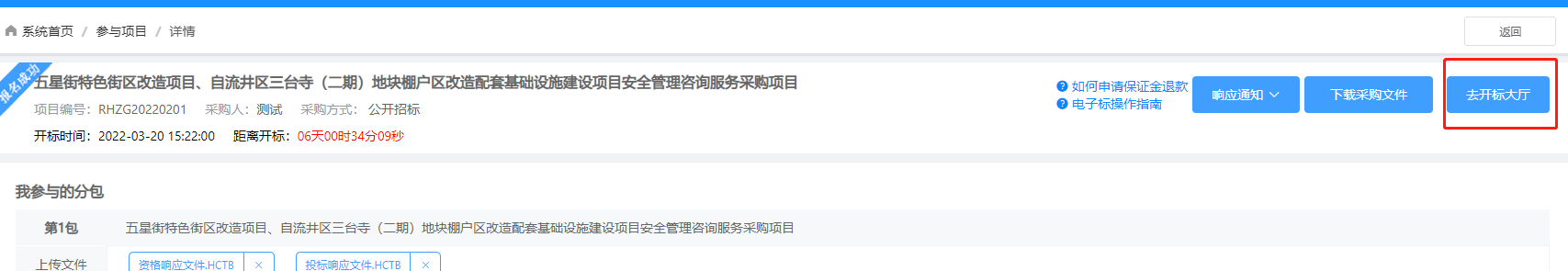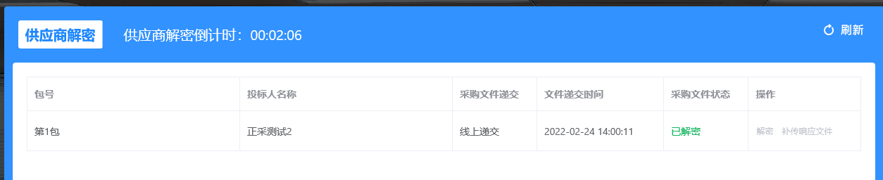 点击“解密”后耐心等待,解密完成后系统会自动刷新出如下界面。(如无法解密,点击【上传响应文件】重新上传文件,此处为供应商解密失败时的解决方式,可直接上传未加密且带有单位及个人签章的文件;如未在开标前进行投标文件上传的操作将无法进入开标大厅)