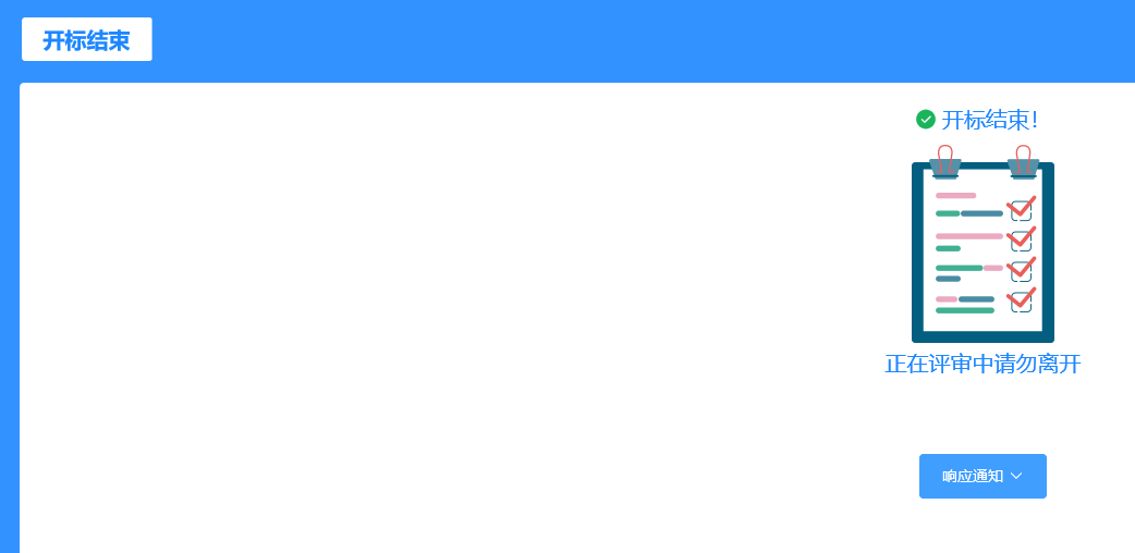 公布结束后,开标结束。开标结束后,如有需要参与磋商/谈判/澄清/协商等操作的供应商,可在此页面等待评审专家发起的磋商/谈判/澄清/协商邀请。